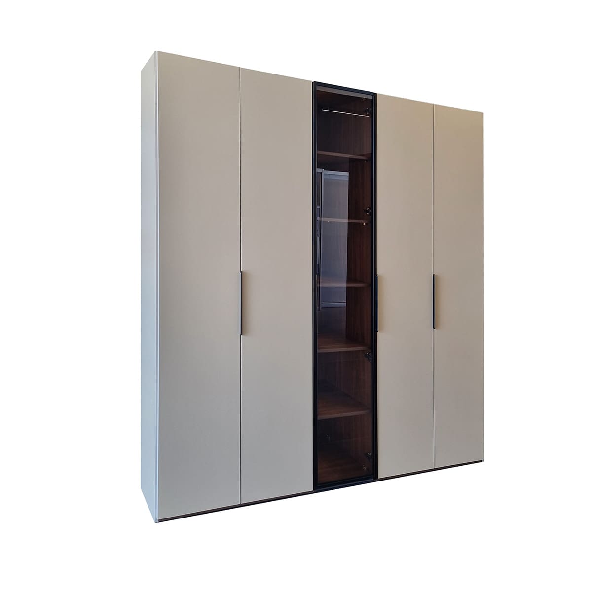 הדלת המרכזית עשויה מזכוכית כהה במסגרת אלומיניום, ומאפשרת הצגת פריטים מועדפים בתוך הוויטרינה. תאורת לד מובנית עם חיישן לכיבוי התאורה בתוך הוויטרינה יוצרת אווירה נעימה ויוקרתית, וזמינה כאופציה נוספת לפי בקשת הלקוח.